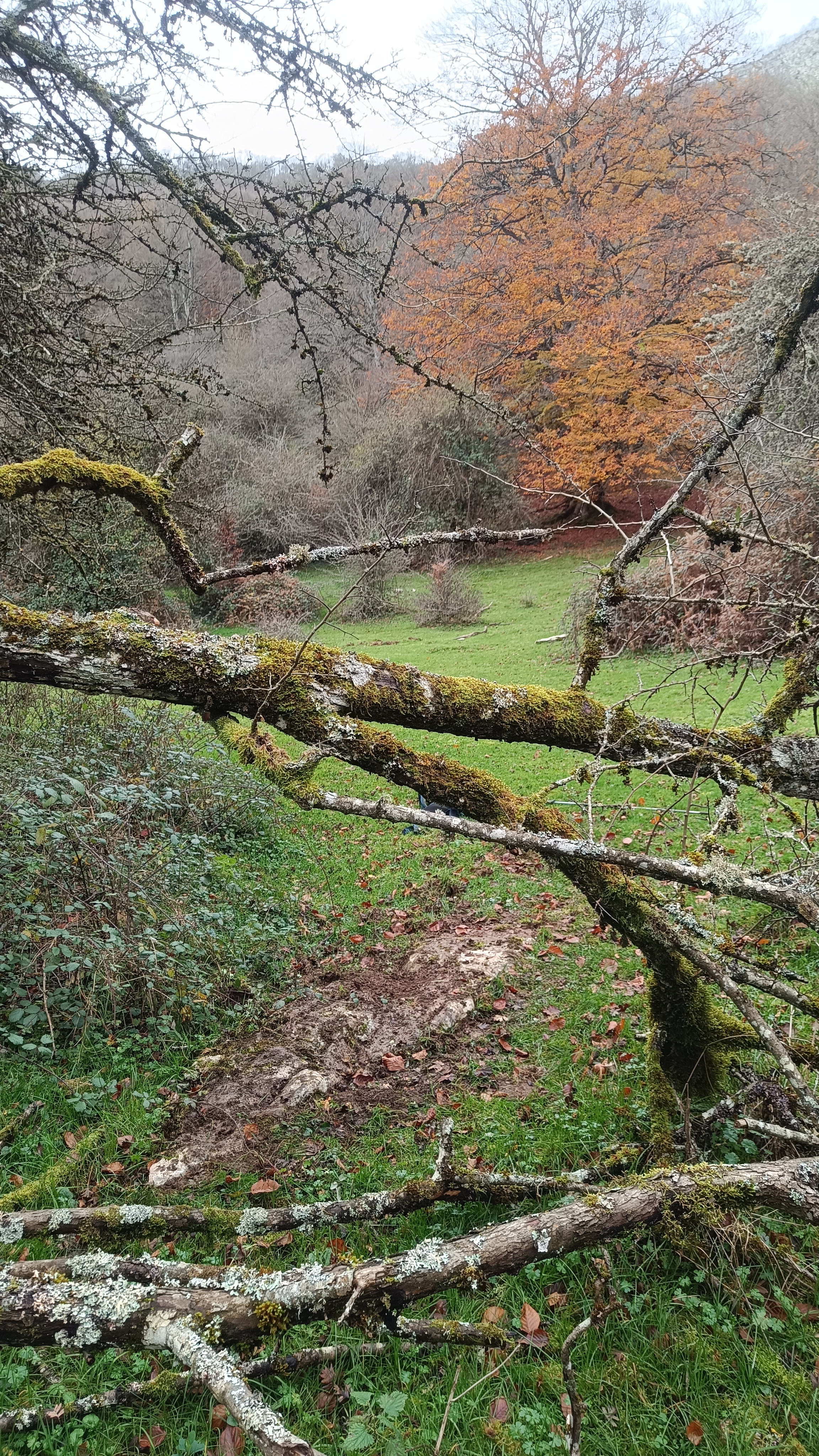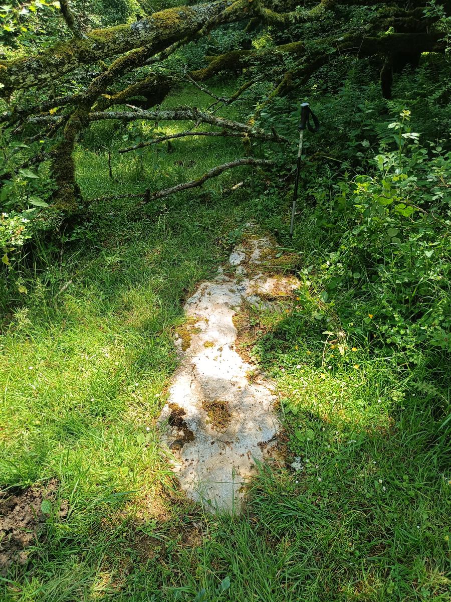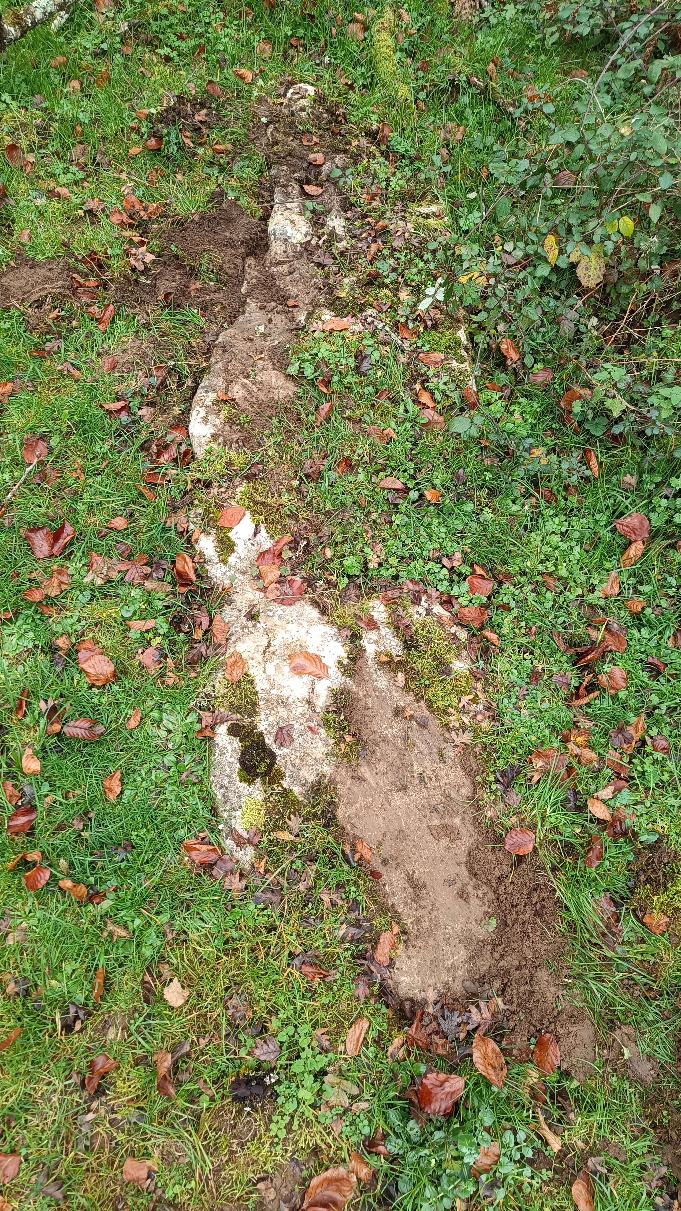 Monolito tumbado, parece que entero. En el momento del hallazgo, cubierto parcialmente de tierra, hierba y musgo.