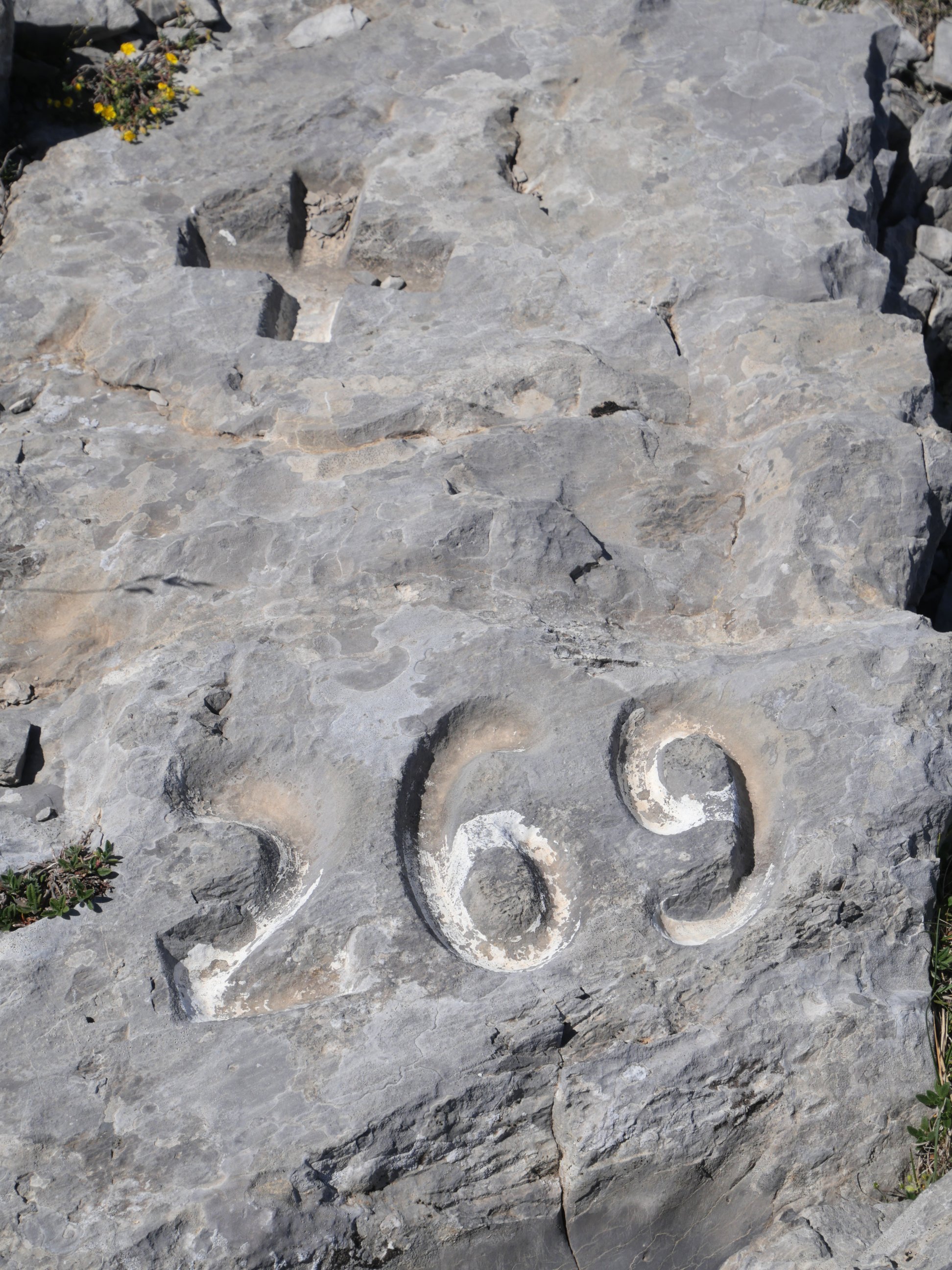 Mugarria eta, aldamenean, harrian zizelkatutako zenbakia. Latras eta Le Pourtet mendien artean.