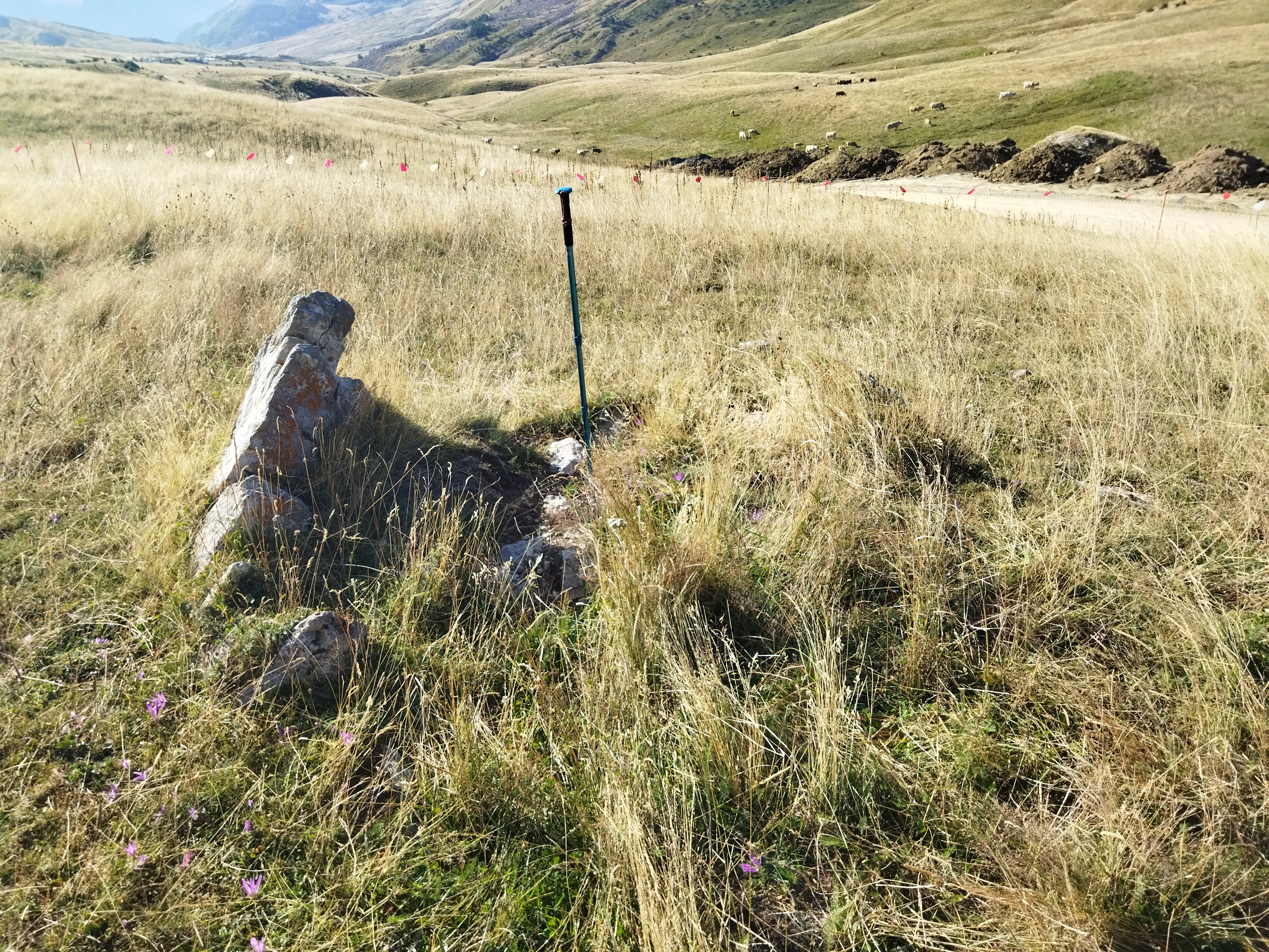 Erdialdean bi harlauza ageri dira eta balizko estalkia tumuluaren gainean datza.