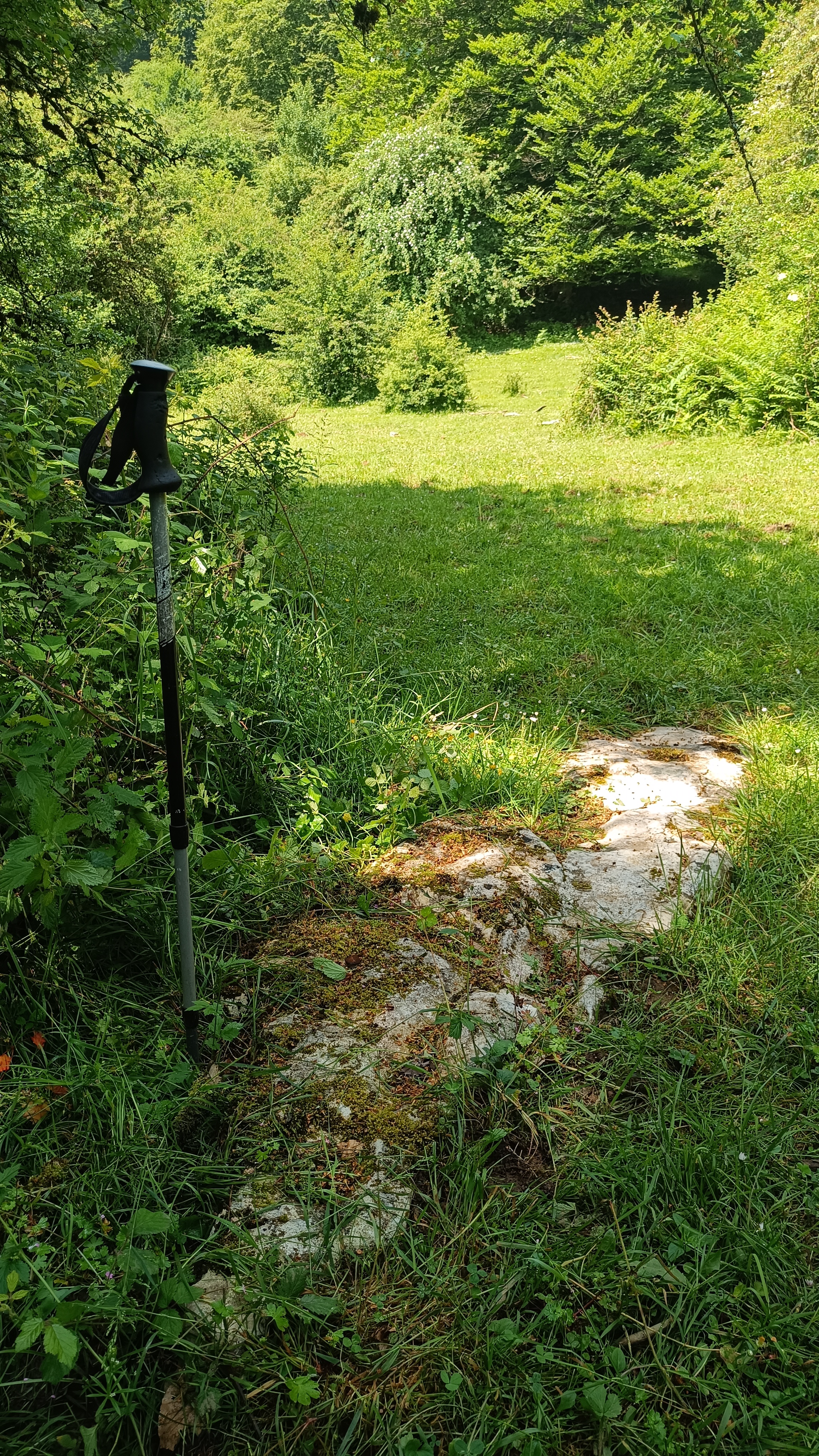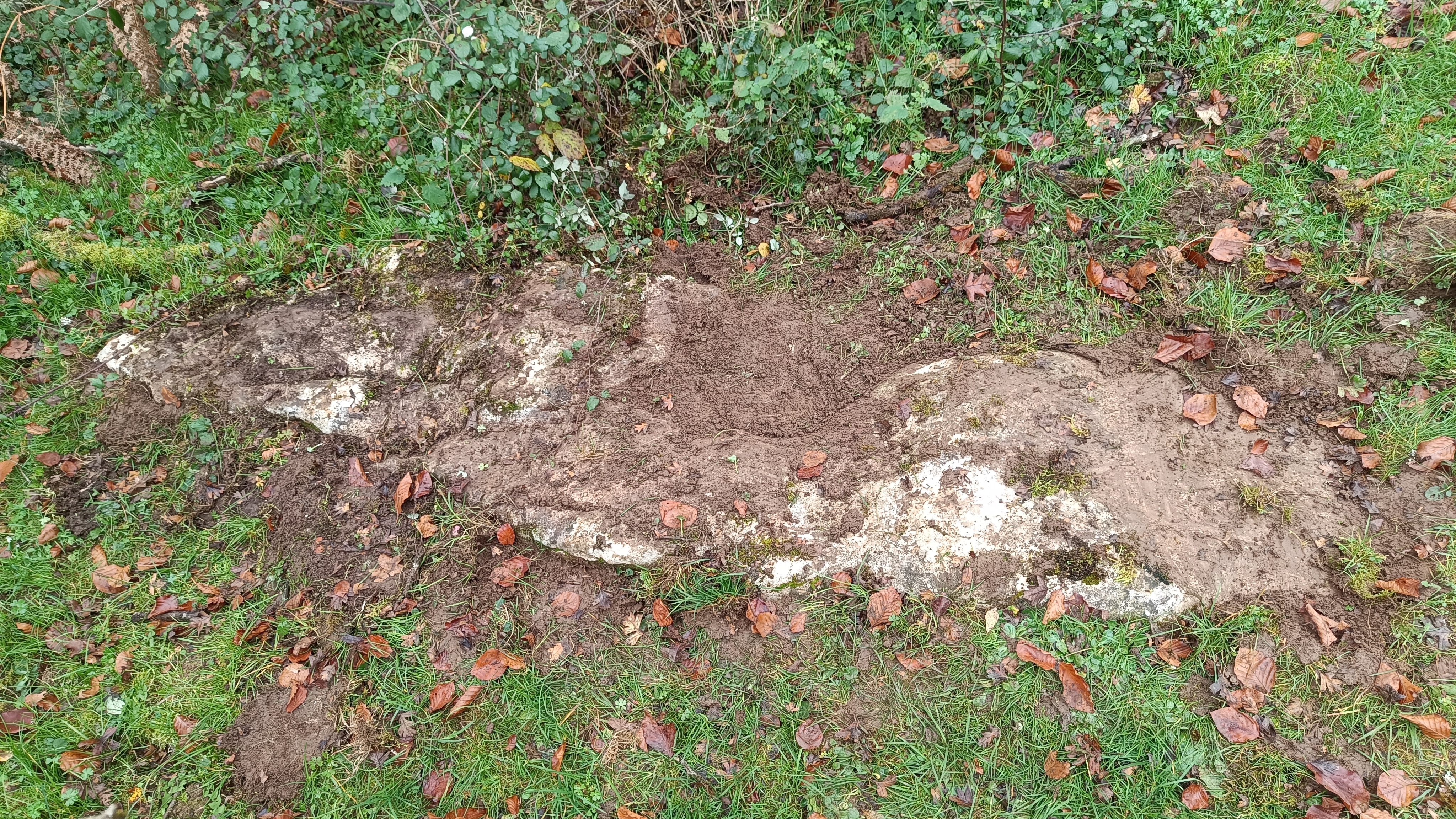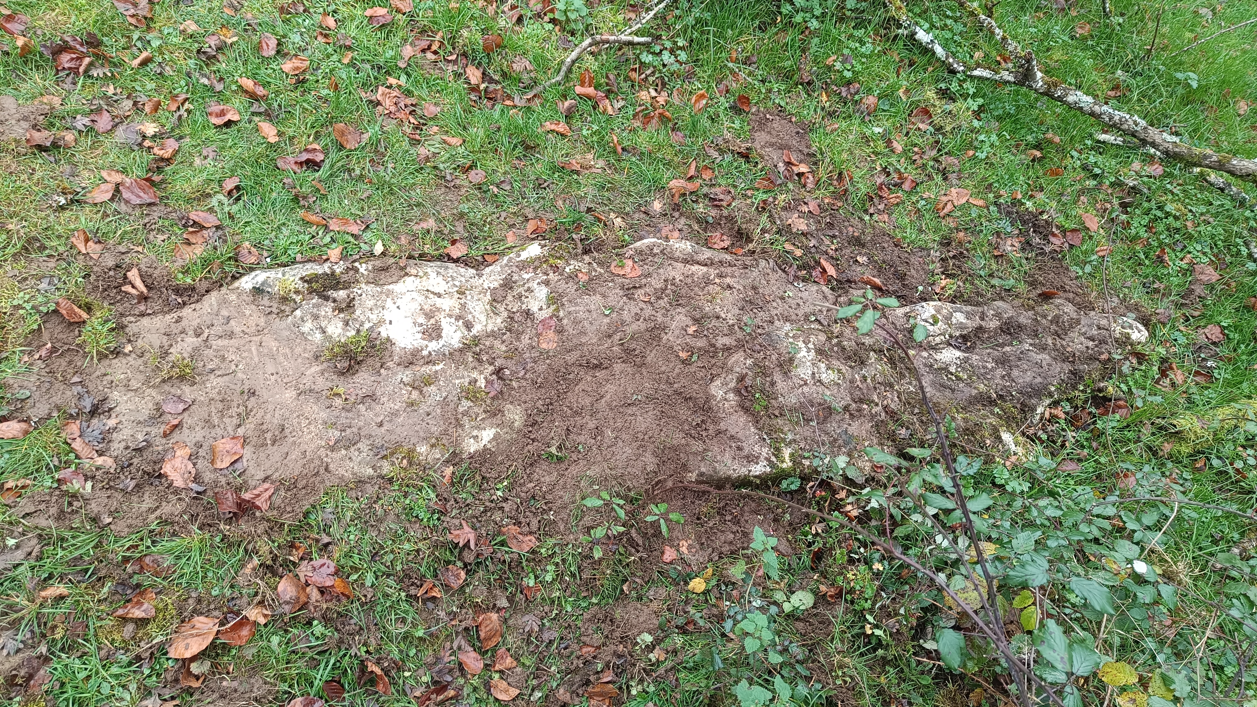Monolito tumbado, parece que entero. En el momento del hallazgo, cubierto parcialmente de tierra, hierba y musgo.