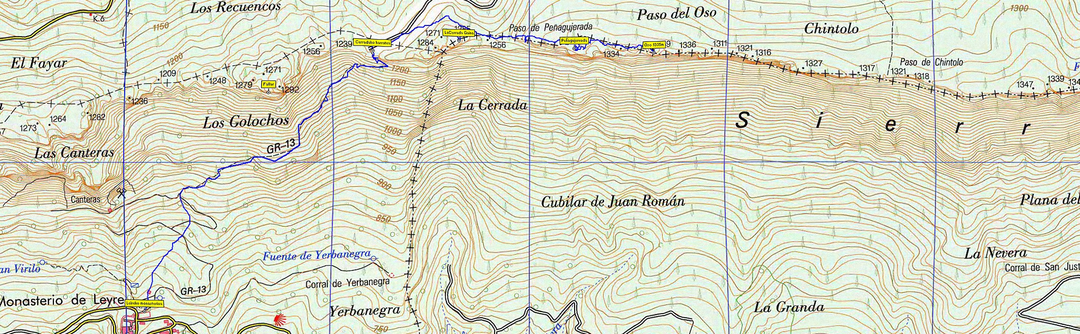 Leireko monasterioaren aparkalekutik abiatuko gara iparralderantz. Etxe abandonatu baten ondotik igarota, ardibide zabalari jarraituko diogu, malda gogorretan gora, pista bizpahirutan zeharkatuz, baina uneoro ipar-ekialdeko norabideari eutsiz. Kastellar haitzen azpitik igaroko gara eta azken metroak sigi-saga eginen ditugu, La Cerrada atakara iritsi arte. Bertan zurezko kartel gezidun bat aurkituko dugu. Ezkerretara joz (mend.) Kastellar edo Arangoiti mendietara joanen gara. Guk ekialderantz joko dugu pistatik hasieran, baina berehala (kairn) ezkerretatik utzi eta ezpel eta pinuen artean igotzen hasiko gara, La Cerrada mendia inguratuz. Bidea hasieran antzemangaitza bada ere, gero markatuago dago. Pinuen basoan, kairn txiki batek La Cerrada mendiaren igoera igarriko digu. Ez dago biderik ezta paisairik ere gailur itxitik. Ekialdeko norabideari eutsiz, bidexkak mendilerroaren ertzetik eramanen gaitu. Hamabost bat minututan Peñagujereada izeneko tokira iritsiko gara. Kontuz ibili behar da, malda gogorak direlako eta labaintzeko arriskua dagoelako. Baina tokia ikusgarria da. Hau ez da mendiaren gailurra, horretarako hogei bat minutu gehiagoz ibili beharko dugu ekialderantz, biderik gabe, baina basoa nahiko garbia da. Oso-ko gailurra kairn batek markatzen digu, eta paisaia apur bat izan nahi izanez gero, gandorrean bilatu beharko dugu harkaitz garbiren bat. On egin! ZURIAIN